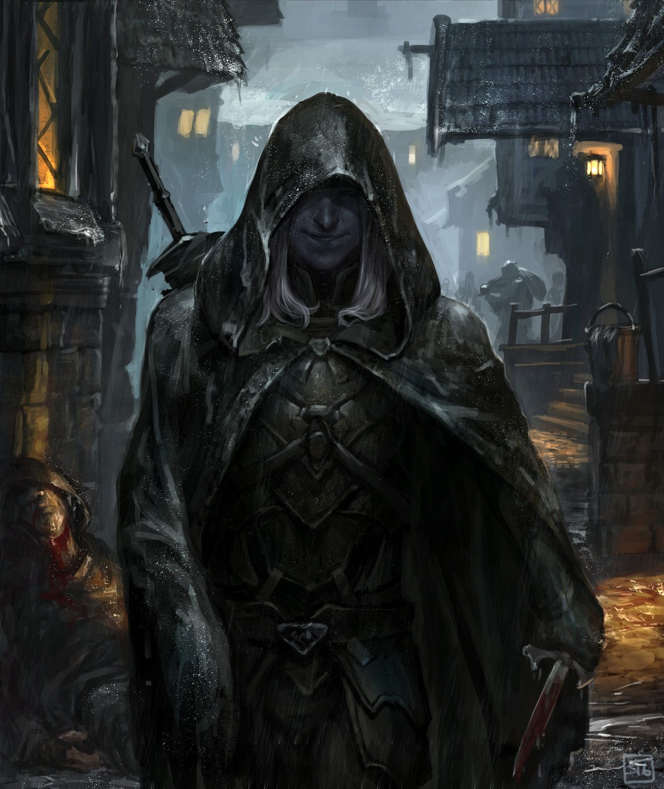 -The trio see the townspeople beginning to pass them as a group of hooded figures walk into the square Leading them is one draped in crimson accented clothing.