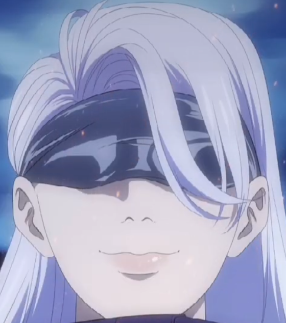 -leaning on the man’s shoulder, is a human with wistful long hair and cloth obscuring her eyes