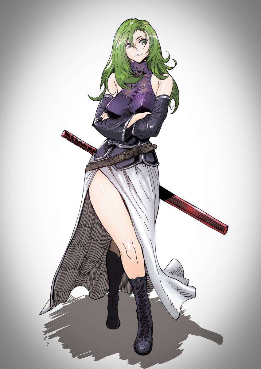 -A green haired woman, accompanied by one of opposing color, both stand at the ready, protecting Iriata and Ester