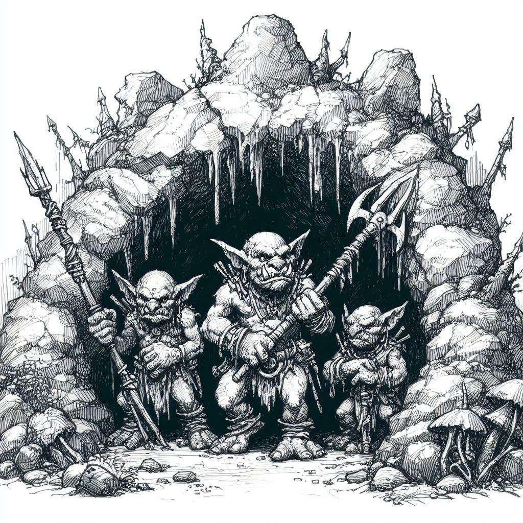 The goblin guards, finishing up some odd game to kill time, end up poking each other with their spears.